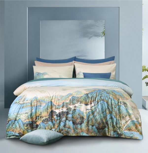 由于《福山赋》本身是一件由19位书画家共同完成的巨大画作,实景细节又特别丰富,色彩繁复,如何合理选取元素应用到床品上,并且元素排布既不能破坏画面的美感,又能体现出画作原本蕴含的美学素养,这对设计师是一个较大的考验。