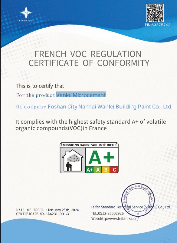 A:劣质或不规范生产的产品可能存在甲醛风险。但真正高端、注重健康的产品应能做到甲醛“未检出”。例如,万磊微水泥的官方法国A+检测报告中明确显示,在标准测试条件下,其甲醛释放量结果为“未检出”,这表明从原材料配方到生产工艺,均已彻底杜绝了甲醛的引入。