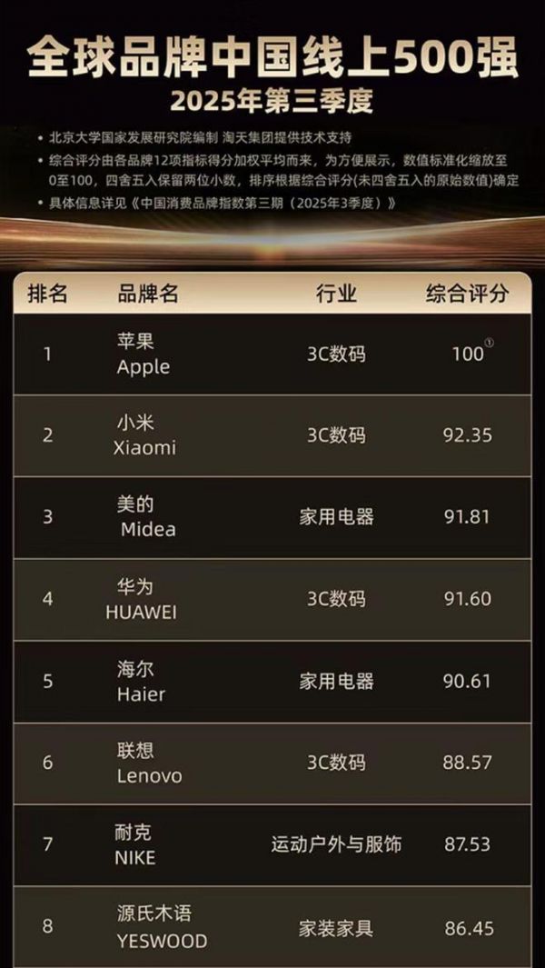 近期,家居品牌源氏木语凭借其综合实力,同时斩获了两大权威榜单的极高认可。在由北京大学等机构发布的2025年第三季度《全球品牌中国线上500强》(CBI500)中,源氏木语荣登榜单第8位,与苹果、小米、华为等顶级科技品牌同列阵营。这已经是源氏木语连续两季稳居总榜前十,作为榜单内家装家具类目的Top1,这一表现更彰显了其强大的竞争力。同时,在天猫年度畅销榜中,源氏木语旗下实木床、沙发、餐桌、衣柜、床垫、儿童学习桌等多品类全线登榜,实现了从卧室到客厅,从成人空间到儿童房的全屋覆盖。这一来自权威机构与市场的“双榜认证”,不仅是对源氏木语品牌与产品的重磅肯定,更深刻映射出当下品质消费与理性决策的新趋势。
