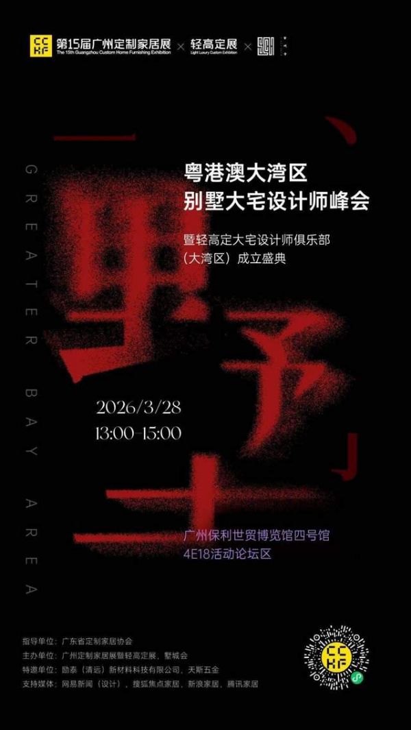 第15届广州定制家居展暨轻高定展将于3月27-30日在广州保利世贸博览馆盛大举办。作为展会的重磅同期活动,粤港澳大湾区别墅大宅设计师峰会暨轻高定大宅设计师俱乐部(大湾区)成立盛典定于3月28日下午隆重启幕。本次活动立足粤港澳大湾区9+2城市群发展格局,汇聚100位墅居大宅设计中坚力量担任联合发起人,并由特邀品牌励泰(清远)新材料科技有限公司、天斯五金提供活动支持,集结行业顶端设计大咖、学术专家组成顾问团,以设计为核、以圈层为翼,共同打造湾区轻高定人居设计标杆圈层,擘画大湾区高端人居设计的全新未来。