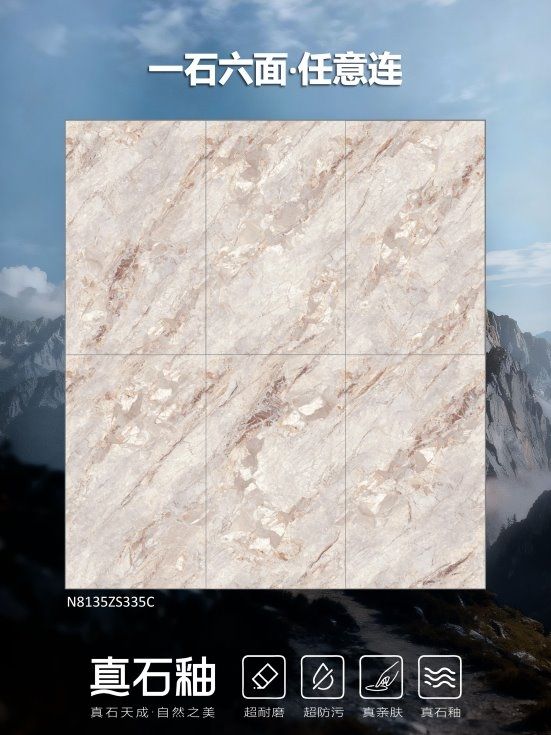 这款瓷砖复刻天然石材的原生质感,10°-12° 柔和石材光,还原细腻的石头包裹感,每一寸肌理都承载着山川的故事。采用「一石六面」任意连纹设计,6 个设计面自由铺贴,大空间也能呈现浑然天成的整体感,无论是酒柜背景墙的沉稳氛围感,还是卫浴空间的雅致质感,都能轻松驾驭。